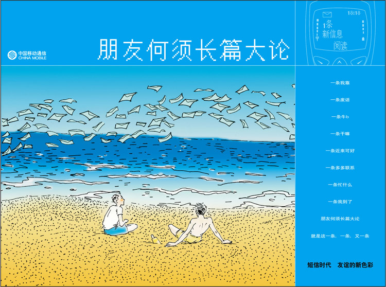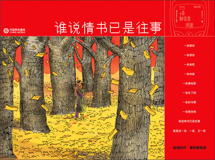 在这个快速消费的时代,我们已经疏于写信了。“家书抵万金”“鸿雁传书”的时代离我们日渐远去。我们进入“短信时代”,这就是现代的书信。我们赋予这个现代通信技术以人性的温情和浪漫。表现形式借用几米的画风,几米的诉求正式这个时代缺乏的。