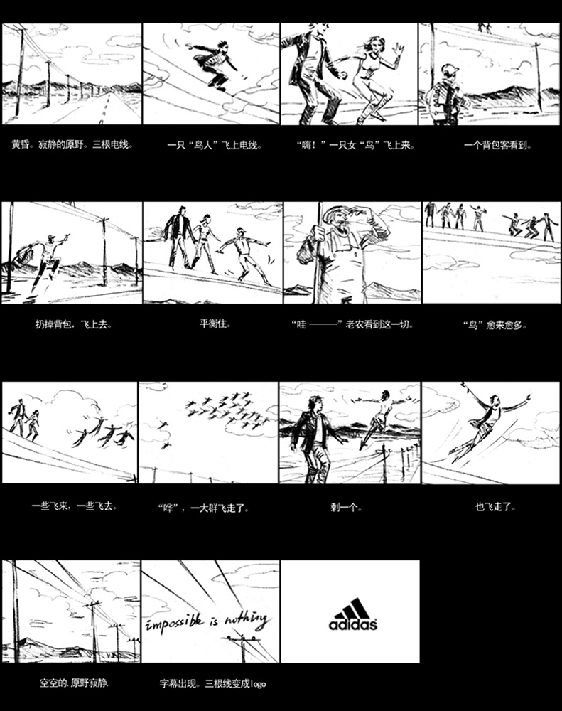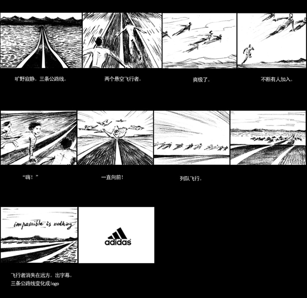 “没有什么不可能”。是的,只要想象力是无限的。在阿迪达斯的世界,没有什么不可能,人可以象鸟一样飞翔,人可以悬空以高速飞行。三条线是阿迪达斯品牌标志的延伸,在我们的创意中,三根电线,三道公路线,现实那是阿迪达斯的世界,而人则突破约束,无所不能。这是一个核心创意,它可以无限延展。无论电视广告、平面广告……
